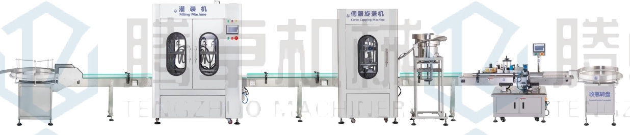 1.全自動(dòng)生產(chǎn)線流程:人工把瓶放到送瓶轉(zhuǎn)盤上-自動(dòng)灌裝-自動(dòng)理蓋下蓋-自動(dòng)旋蓋-自動(dòng)打碼-自動(dòng)貼標(biāo)-人工收瓶